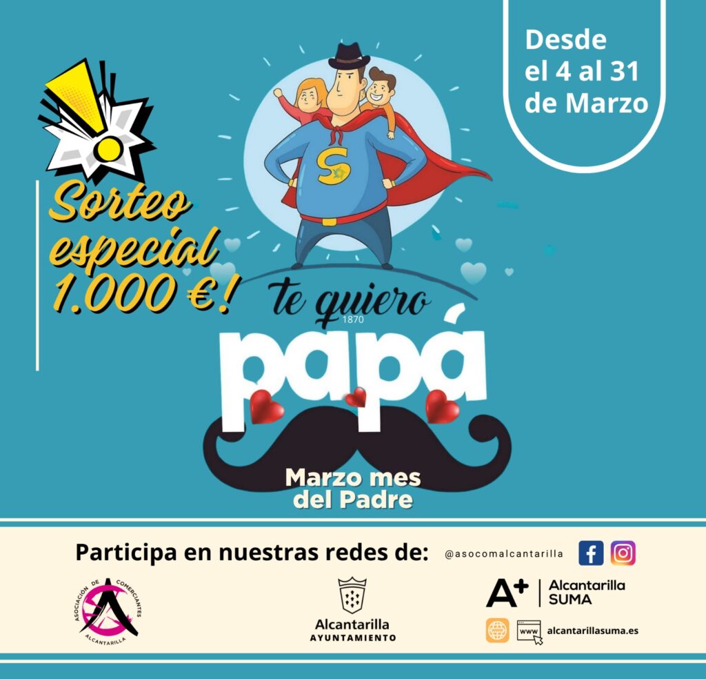 Comparte esta noticia: Facebook Twitter Pinterest LinkedIn ¡¡¡Súper Sorteo por el Mes del Padre!!! 1.000€ en premios comprando en #Alcantarilla !!!!🤑🎁🤩 Se sortearán 20 cheques de 50€ entre todos los participantes. ¿Y qué tienes que hacer para ganar uno de esos cheques de 50€? Muy fácil, te lo cuento!! 😉 Facebook:1. Dale a «ME GUSTA» […]
